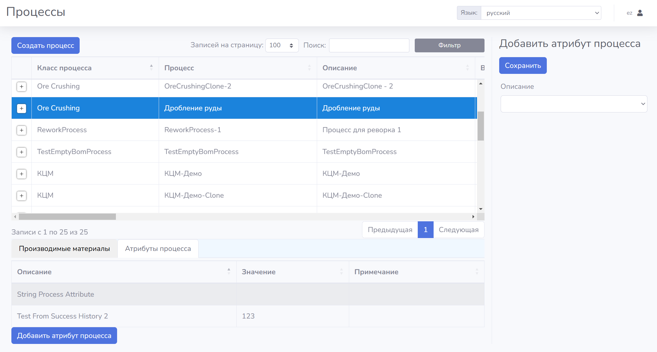 Для конфигурирования доступных в производственной модели процессов необходимо воспользоваться пунктом меню «Управление процессами – Процессы».