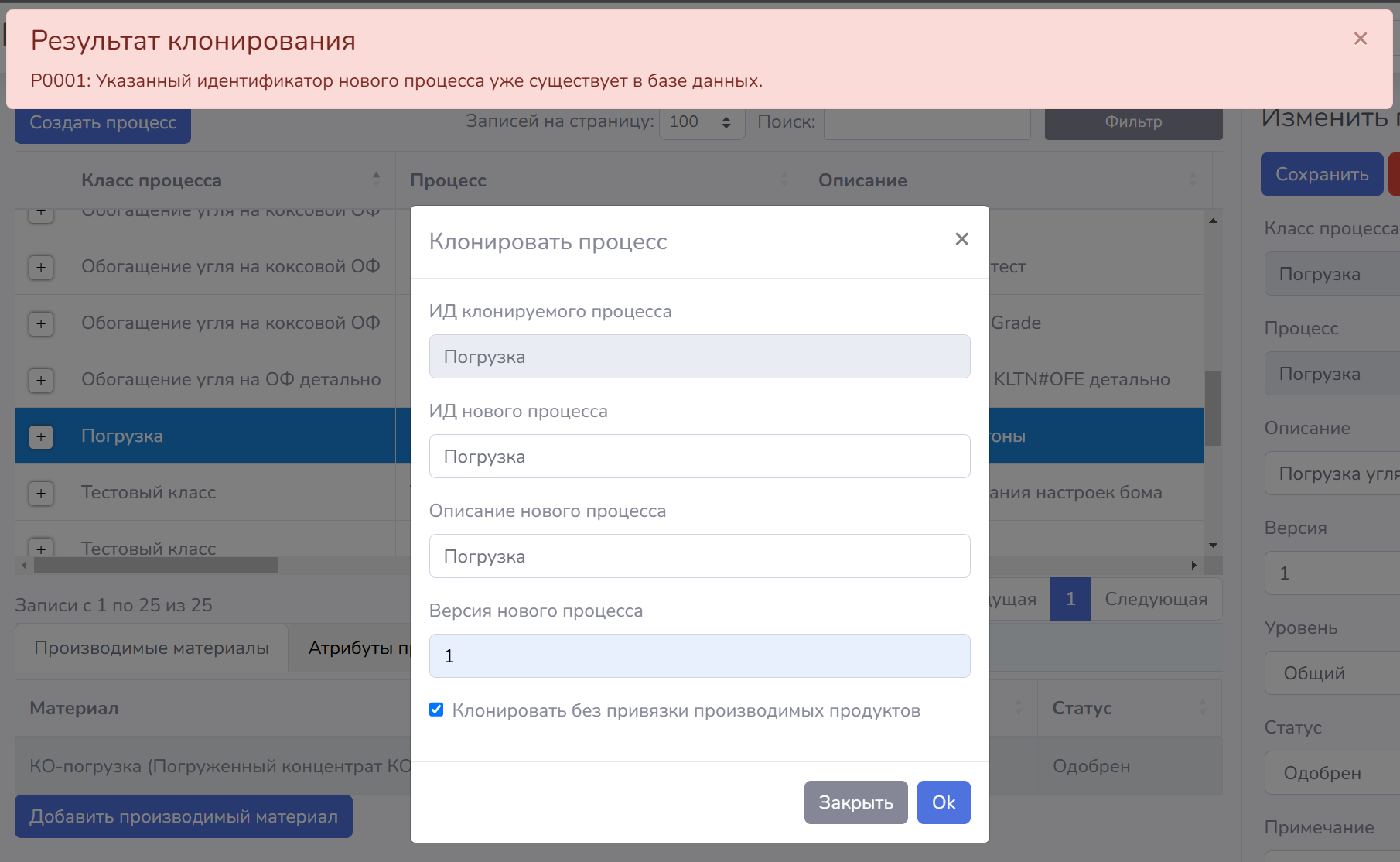 В случае если клонирование процесса завершилось без ошибок вы получите соответствующее всплывающее уведомление, если в процессе клонирования будут обнаружены ошибки, вы получите уведомление об ошибке с детальным описанием ошибки и кодом ошибки. |