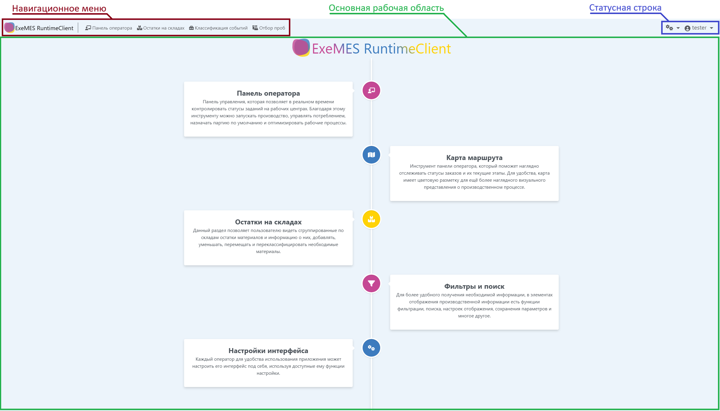 Рабочая область окна ExeMES RuntimeClient состоит из 3-х частей: