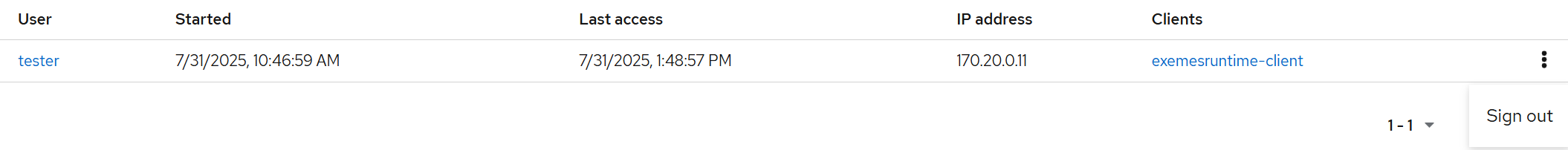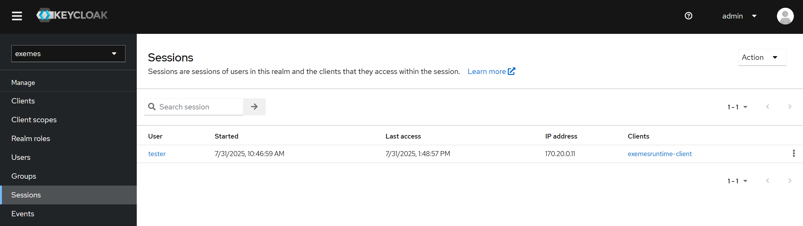 Expand title Инструкция Для завершения сессии пользователя необходимо в левом меню Keycloak выбрать реалм «exemes» и перейти в пункт меню «Sessions»:
