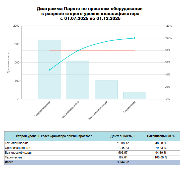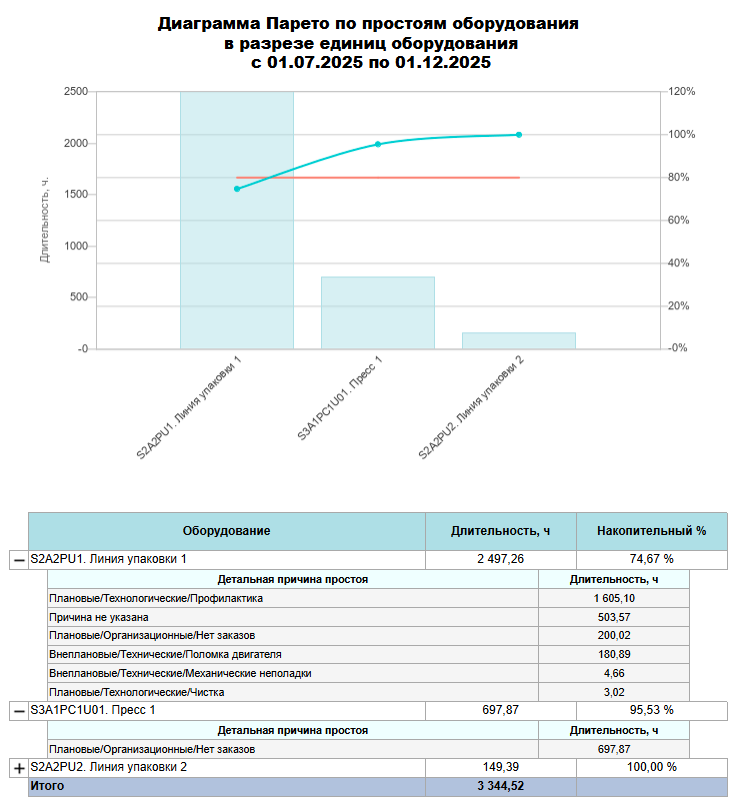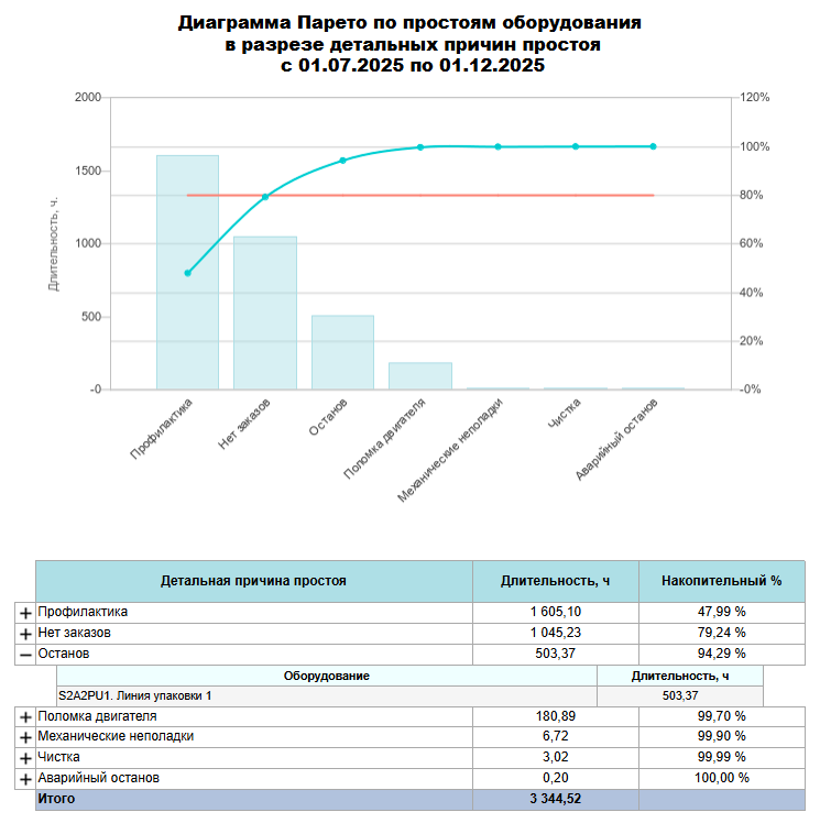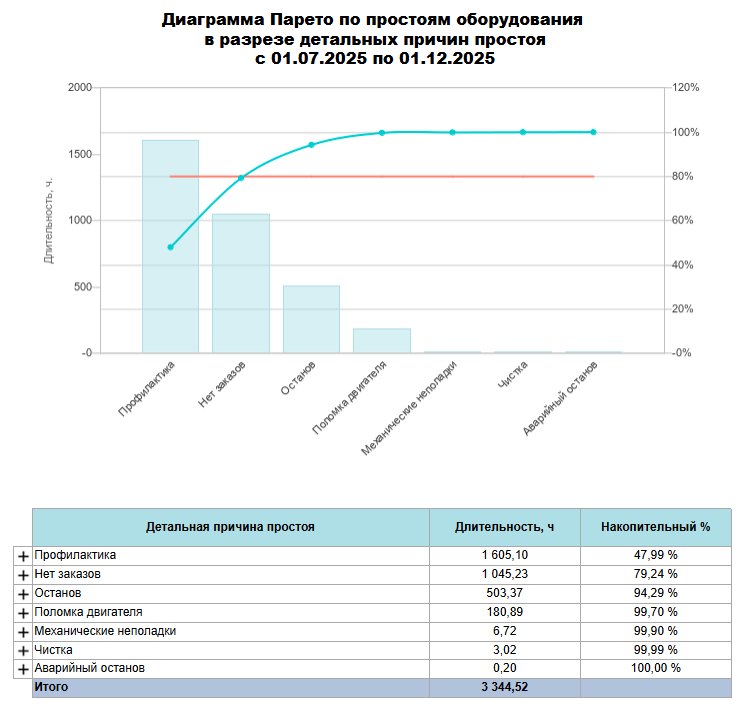Процент является накопительным, т.е. причины состояния/оборудование/группы причин состояний располагаются в таблице в порядке убывания: от максимального по количеству часов простоев к минимальному и накопительный процент для первой строчке рассчитывается как "длительность простоев по выбранному критерию"/"общая длительность простоев в периоде", для последующих строчек - "длительность простоев по выбранному критерию"/"общая длительность простоев в периоде" + процент от предыдущей строки.