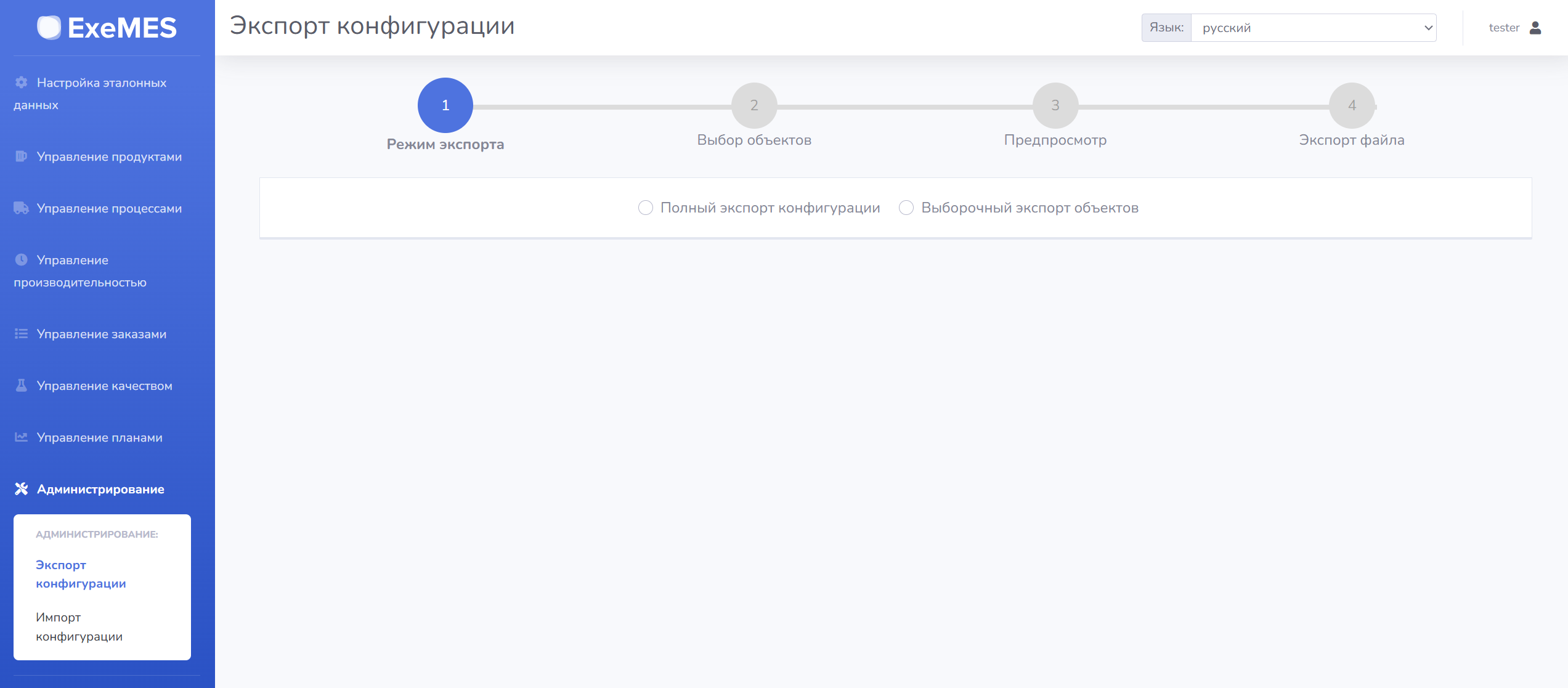 Экспорт конфигурации позволяет выгрузить производственную модель ExeMES в файл. Данная опция может быть востребована при переносе производственной модели между средами разработки, тестирования и продуктивной средой или при необходимость массового изменения объектов производственной модели путем группового редактирования или замены в текстовом файле.