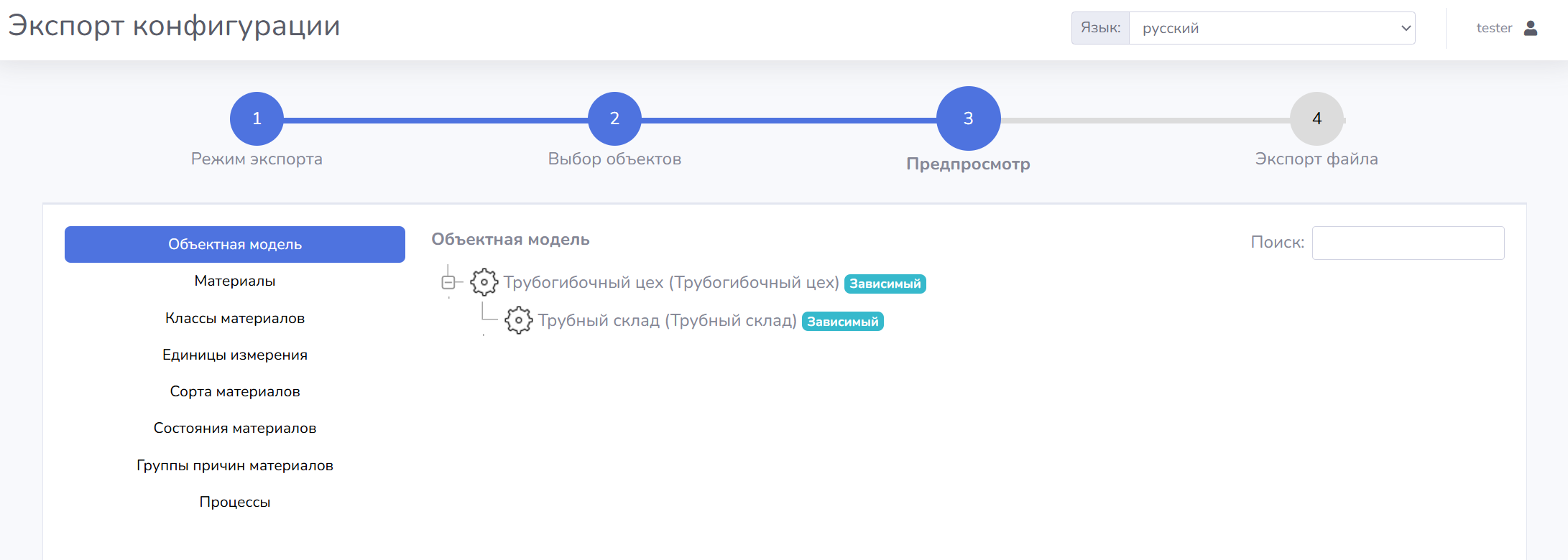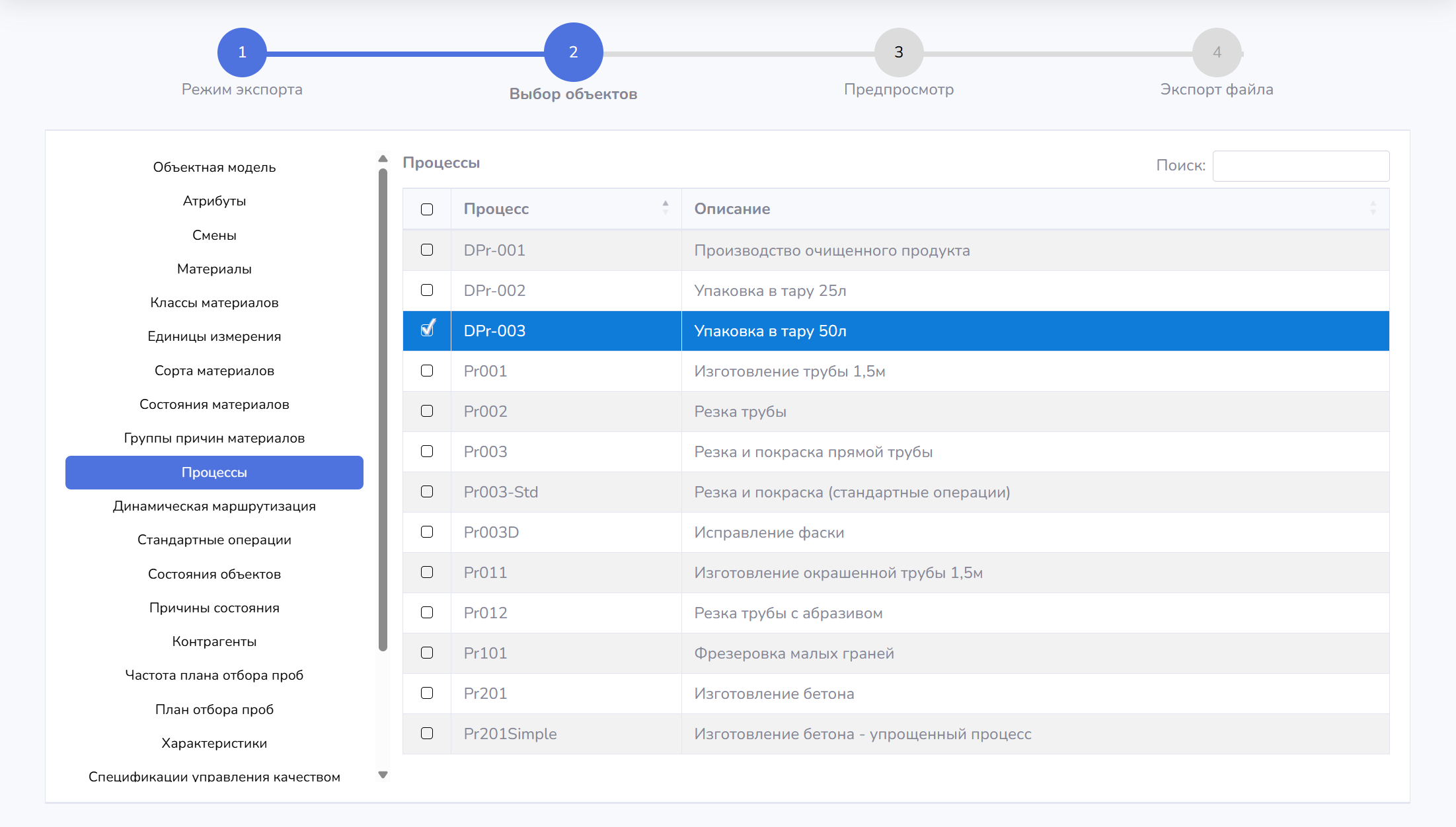 При выборочном экспорте можно переключаться между шагами 2 и 3 для изменения перечня экспортируемых объектов