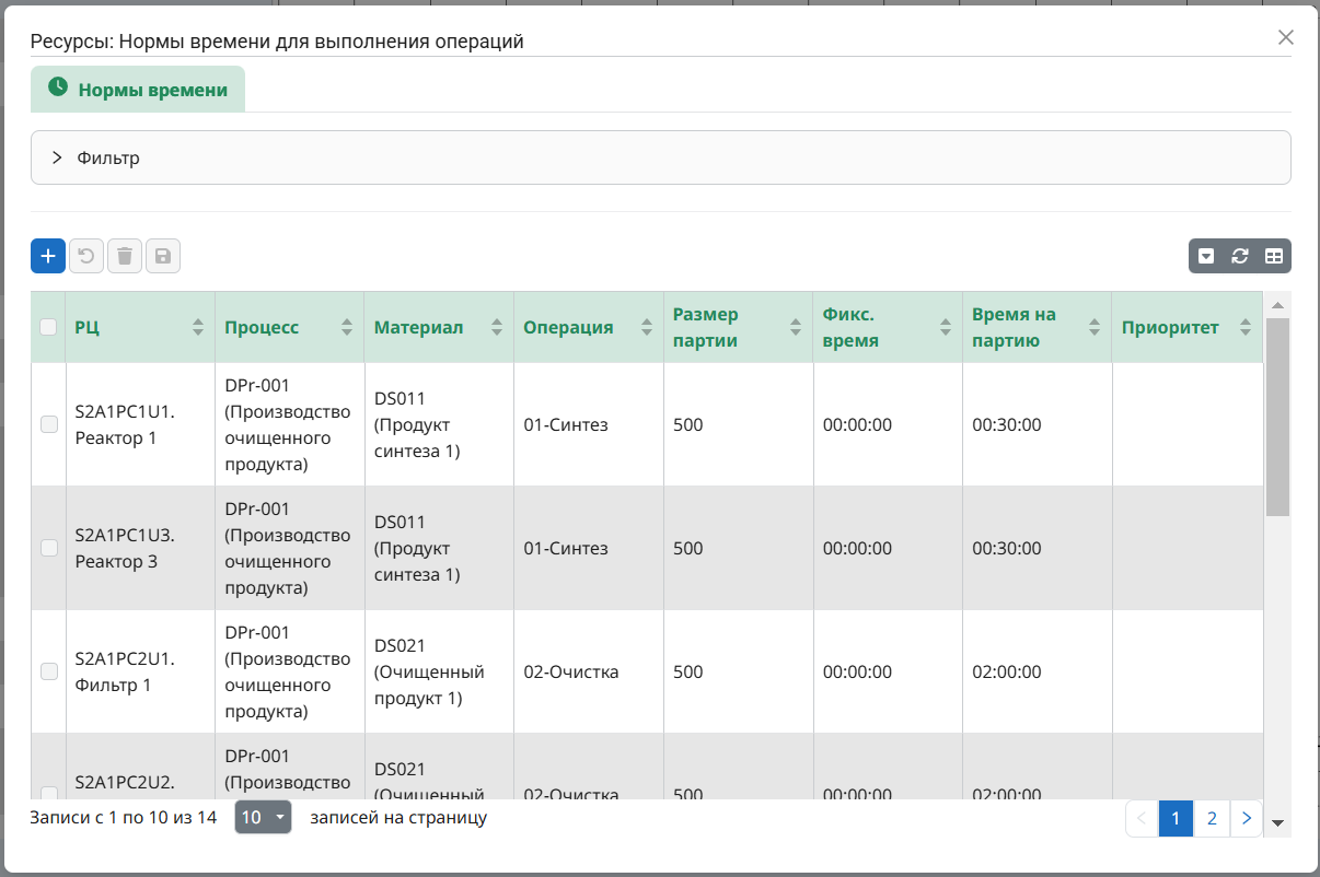- Процесс - производственный процесс, необходимо выбрать процесс из выпадающего списка доступных процессов (доступен текстовый фильтр для поиска процесса);