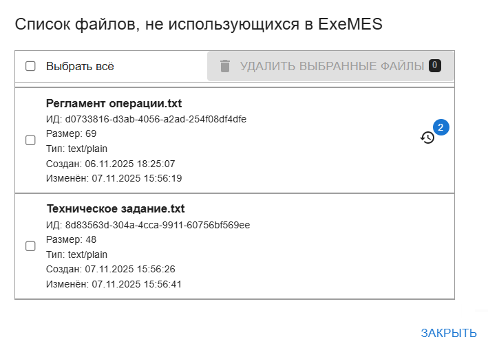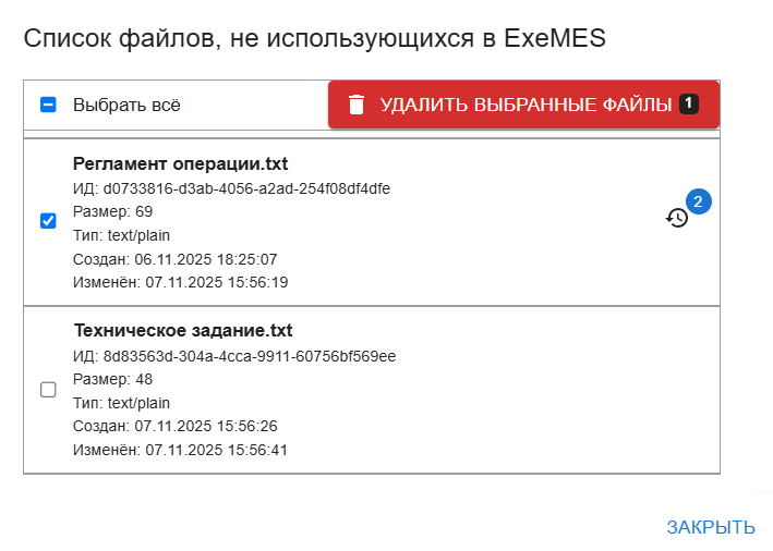 Функционал очистки неиспользуемых файлов доступен при наличии у пользователя роли Admin (см. инструкцию по управлению доступом к ExeMES).
