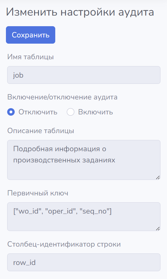 • включение/отключение аудита – переключатель включения/отключения аудита по выбранной таблице;