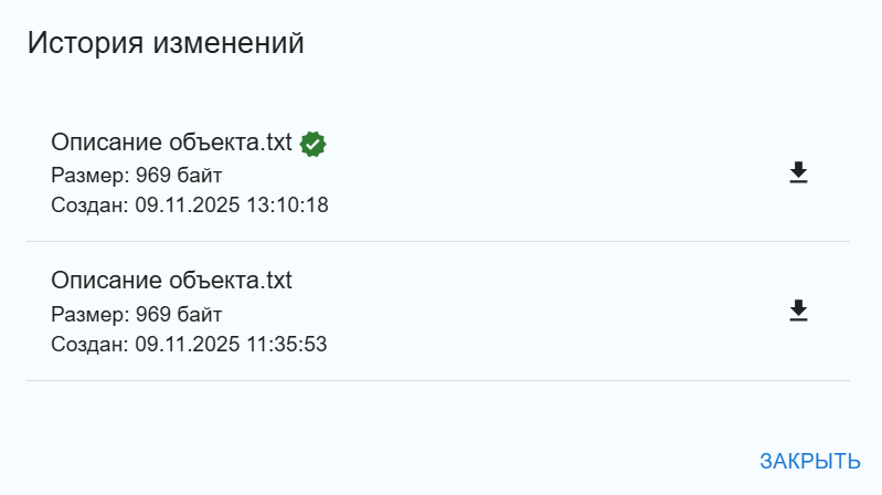 Для просмотра истории изменений файла необходимо выбрать нужный файл в окне работы с файлами, нажать на кнопку вызова контекстного меню работы с файлом и выбрать пункт контекстного меню «История изменений», после чего история изменений файла (все версии) будет представлена во всплывающем окне.