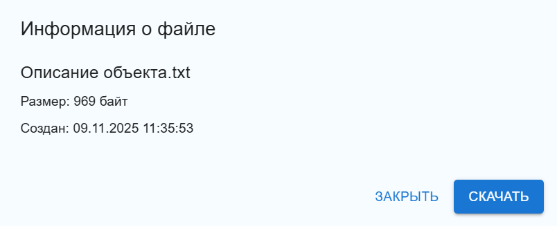Для просмотра информации (метаданных) о файле необходимо выбрать нужный файл в окне работы с файлами, нажать на кнопку вызова контекстного меню работы с файлом и выбрать пункт контекстного меню «Информация о файле», после чего информация о файле будет представлена во всплывающем окне.