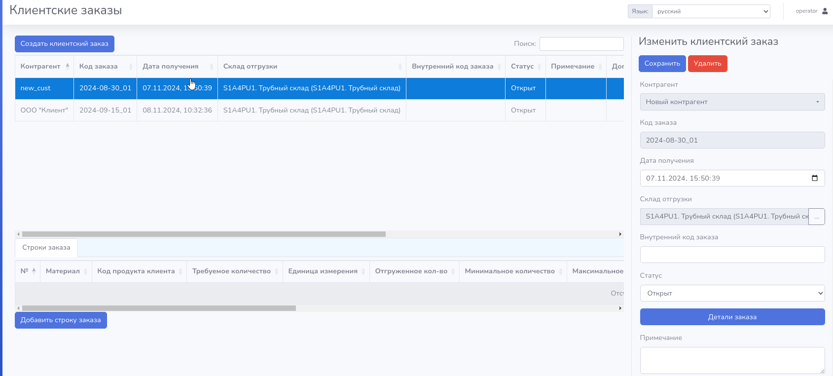 Для создания нового клиентского заказа необходимо воспользоваться кнопкой «Создать клиентский заказ», после чего в контекстном окне внести необходимые данные. Для каждого клиентского заказа необходимо указать: